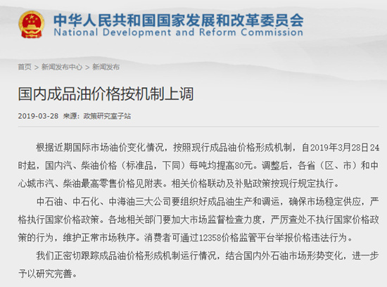 人民網(wǎng)北京3月28日電 (王紹紹) 國(guó)家發(fā)改委剛剛發(fā)布通知, 根據(jù)近期國(guó)際市場(chǎng)油價(jià)變化情況,按照現(xiàn)行成品油價(jià)格形成機(jī)制,自2019年3月28日24時(shí)起,國(guó)內(nèi)汽、柴油價(jià)格(標(biāo)準(zhǔn)品,下同)每噸均提高80元。調(diào)整后,各省(區(qū)、市)和中心城市汽、柴油最高零售價(jià)格見(jiàn)附表。相關(guān)價(jià)格聯(lián)動(dòng)及補(bǔ)貼政策按現(xiàn)行規(guī)定執(zhí)行。