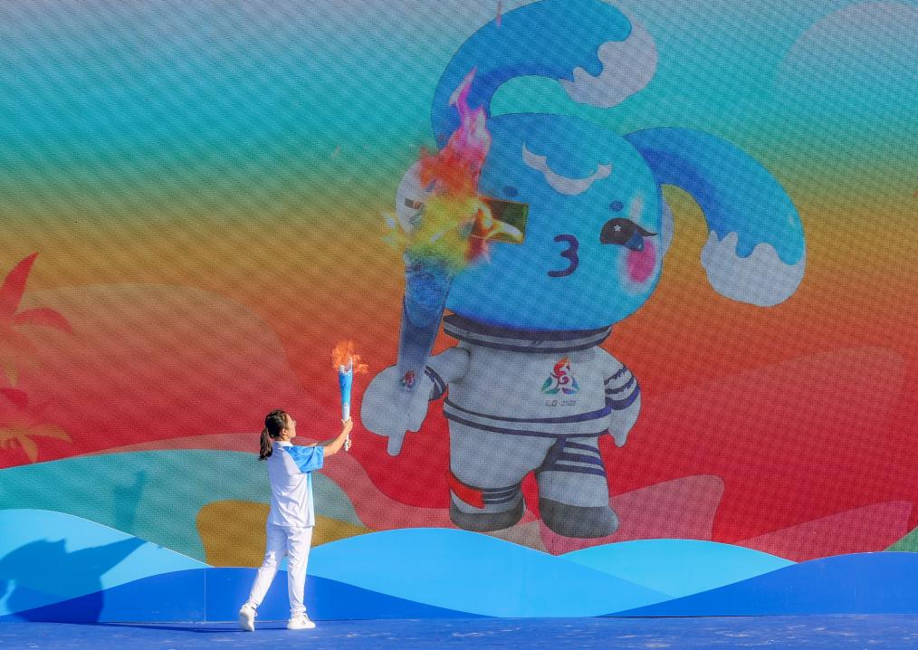 11月17日,火炬手韓曉燕在起跑儀式上與本屆運動會吉祥物“吉貝”對接,點燃火炬。新華社記者 陳朔 攝