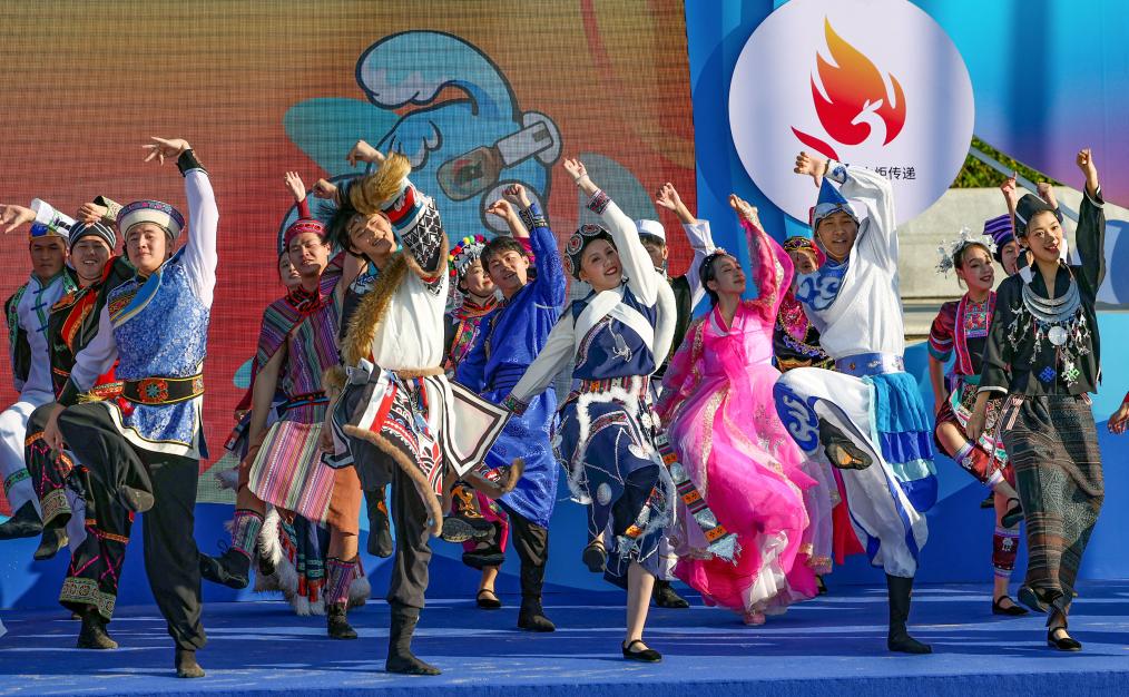 11月17日,演員在第十二屆全國少數(shù)民族傳統(tǒng)體育運動會火炬實地傳遞活動起跑儀式上表演。新華社記者 陳朔 攝