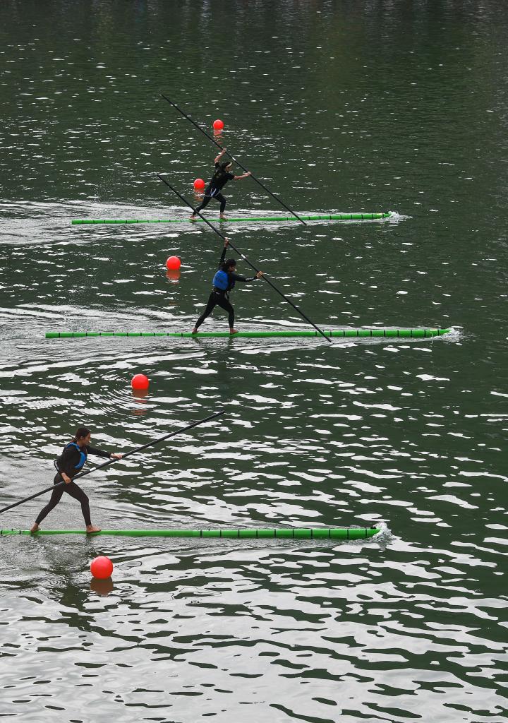 6月11日,選手在貴州省鎮(zhèn)遠(yuǎn)縣?陽河上進(jìn)行獨竹漂比賽。新華社記者 楊文斌 攝