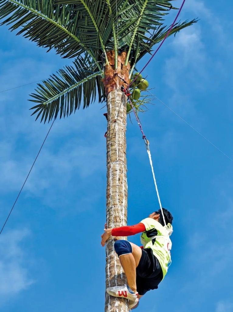如果你對巴黎奧運會上用時最短的項目——速度攀巖意猶未盡,在本屆運動會上,可以關(guān)注速度攀巖“海南版”——攀椰競速。