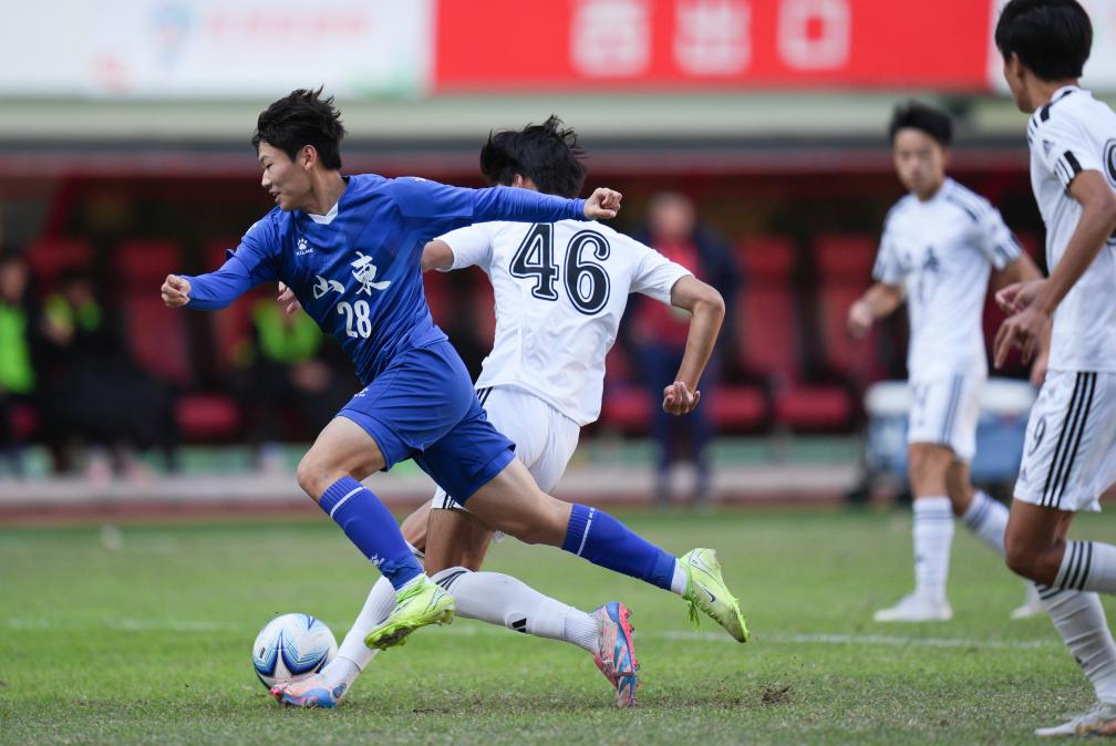 11月27日,山東隊(duì)球員陳子涵(左一)在比賽中進(jìn)攻。當(dāng)日,在第一屆青少年三大球運(yùn)動(dòng)會(huì)男足決賽中,山東隊(duì)奪得冠軍。新華社記者 薛宇舸 攝