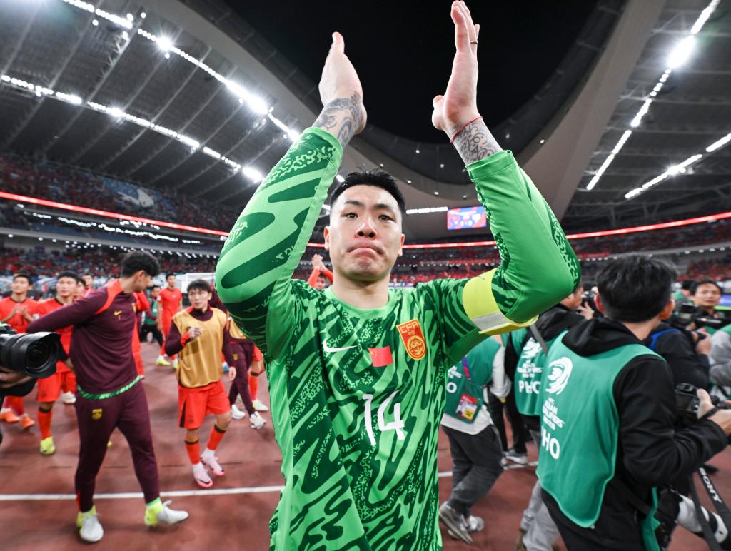 11月19日,在與日本隊(duì)的比賽后,中國(guó)隊(duì)守門員王大雷向球迷致意。新華社記者 姜克紅 攝