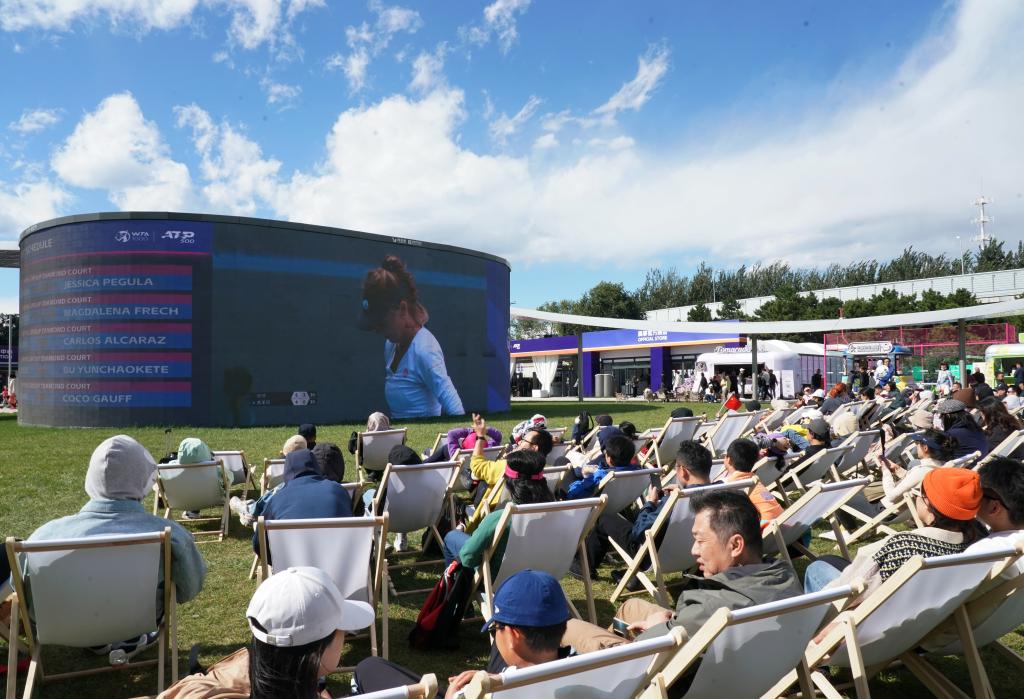 10月1日,在北京國(guó)家網(wǎng)球中心,游客在躺椅上觀看中國(guó)網(wǎng)球公開賽賽事直播。新華社記者 張晨霖 攝