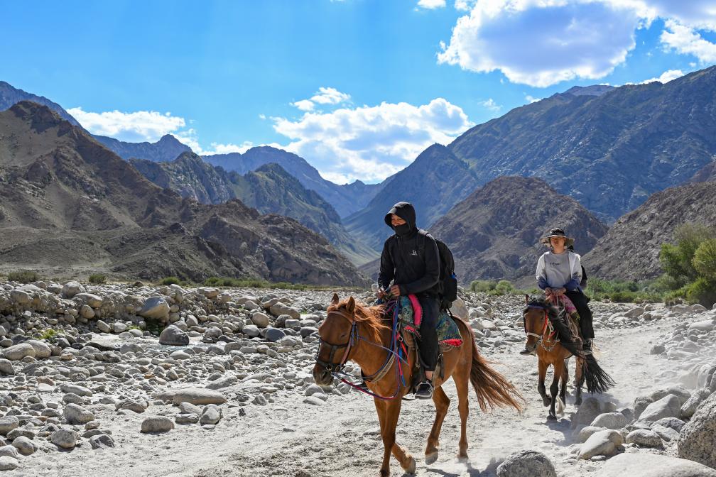 6月9日,游客騎馬進(jìn)入烏孫古道體驗(yàn)。當(dāng)日,在新疆阿克蘇地區(qū)拜城縣,2024年新疆“跟著賽事去旅行”烏孫古道國(guó)際徒步露營(yíng)大會(huì)啟動(dòng)。新華社記者 陳朔 攝