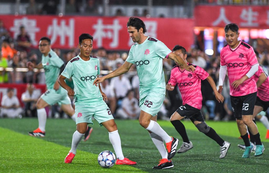 5月27日,卡卡(中)在“逐夢(mèng)”冠軍明星公益賽中。當(dāng)日,“逐夢(mèng)”冠軍公益賽在貴州省黔東南苗族侗族自治州榕江縣“村超”球場(chǎng)舉行。新華社記者 楊文斌 攝