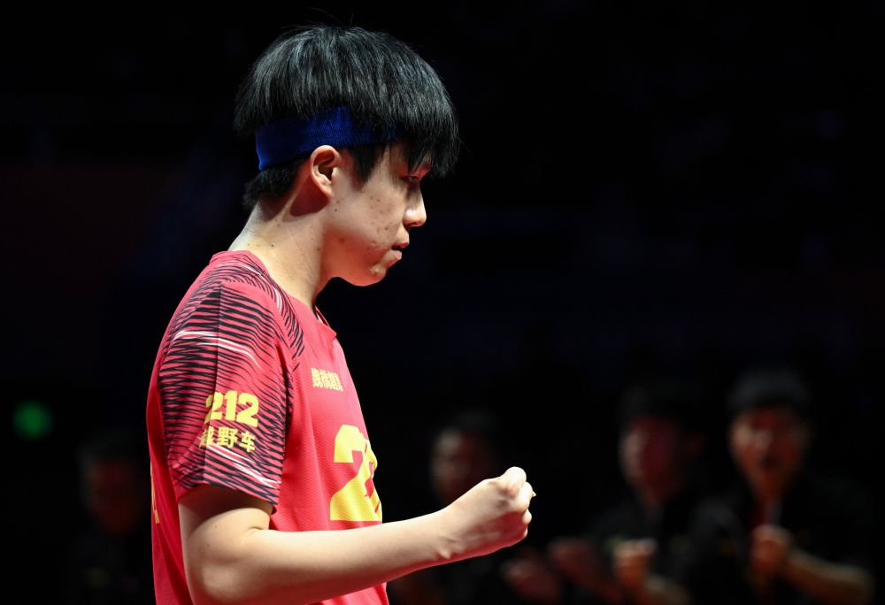 1月1日,山東魏橋·向尚運(yùn)動(dòng)隊(duì)選手王楚欽在單打比賽中慶祝。新華社發(fā)(陳浩明攝)