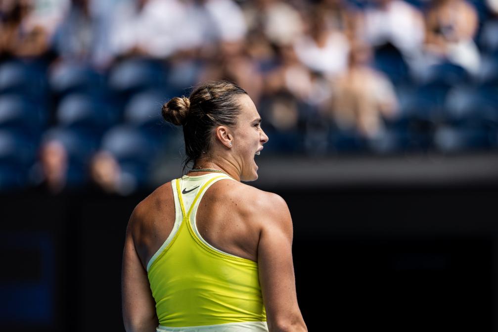 1月15日,薩巴倫卡在比賽中慶祝得分。新華社發(fā)(胡涇辰攝) 男單賽場(chǎng),19歲的捷克小將門??艘?:2、3:6、6:1和6:4擊敗魯?shù)?,首次躋身澳網(wǎng)32強(qiáng)。焦科維奇以6:1、6:7(4)、6:3、6:2戰(zhàn)勝來自葡萄牙的資格賽選手法利亞。這是焦科維奇的第430場(chǎng)大滿貫比賽,至此,他超越費(fèi)德勒成為大滿貫單打比賽出場(chǎng)次數(shù)最多的運(yùn)動(dòng)員。