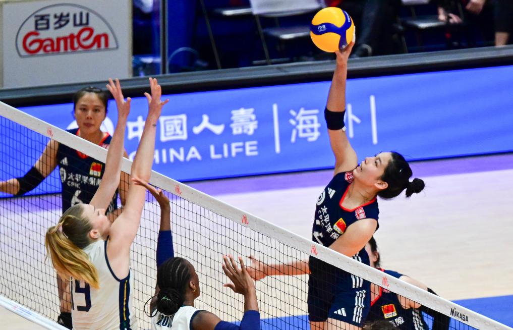6月22日,中國隊(duì)球員莊宇珊(右上)在比賽中進(jìn)攻。新華社記者 朱煒 攝