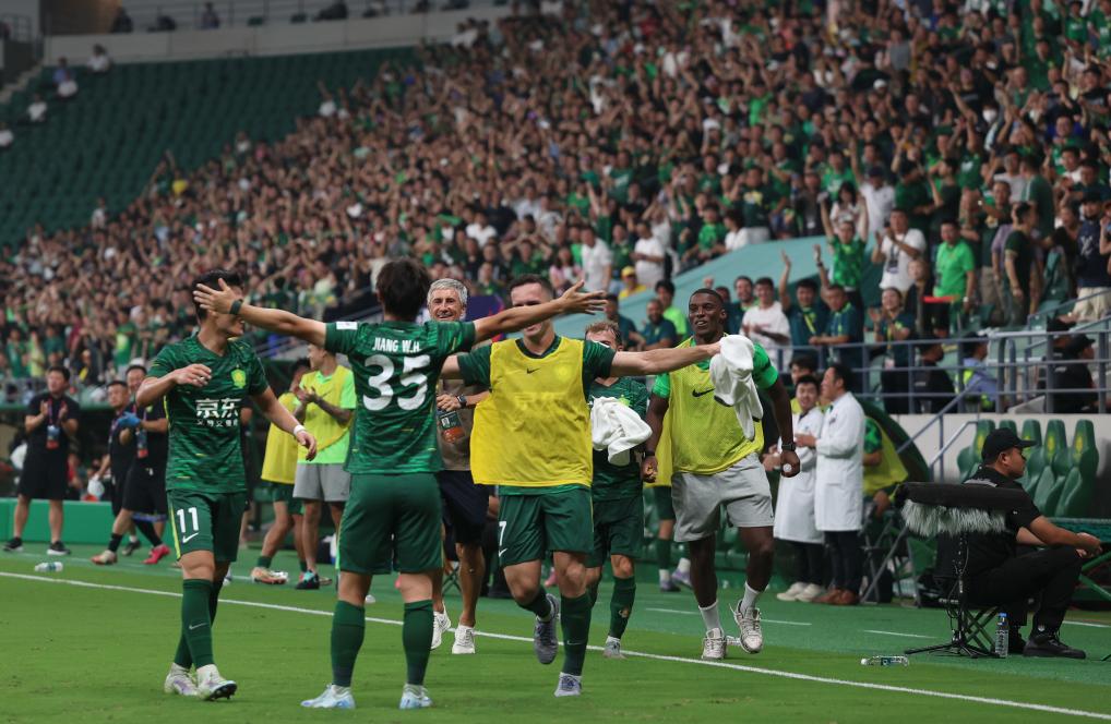 8月20日,北京國安隊球員江文豪(左二)在比賽中進(jìn)球后慶祝。新華社記者 胡星宇 攝