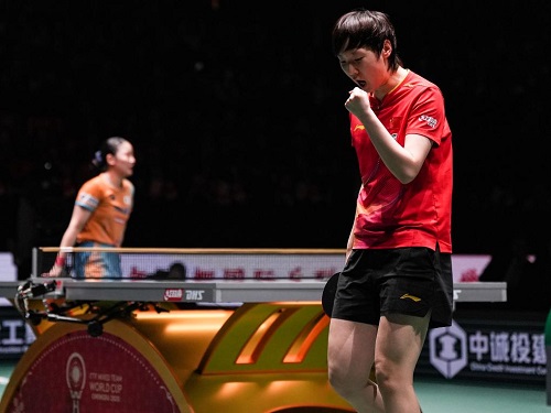 女單比賽王曼昱迎戰(zhàn)張本美和。王曼昱將自己護臺面積大、移動范圍廣、反手斜線威脅大的特點充分發(fā)揮,限制了張本美和的速度,從而為中國隊再下三局,總比分6:0領(lǐng)先。