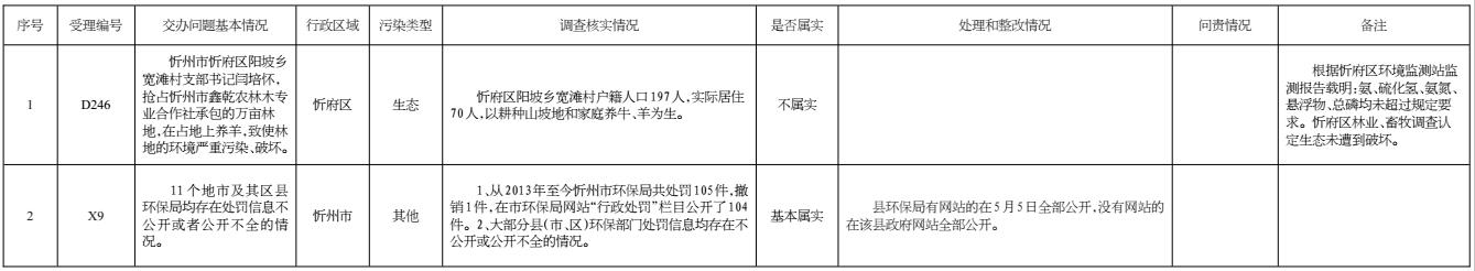 2017年5月2日晚,收到省群眾反映問(wèn)題處置組督辦的第四批群眾反映問(wèn)題共計(jì)2件。其中重點(diǎn)案件1件。我市高度重視,立即組織查處,截至5月5日,督辦的2件群眾反映問(wèn)題已辦結(jié)。其中,確認(rèn)基本屬實(shí)1件、不屬實(shí)1件。對(duì)于環(huán)保部門(mén)存在處罰信息不公開(kāi)或者公開(kāi)不全的情況,各縣(市、區(qū))已于2017年5月5日前全部在政府網(wǎng)站或環(huán)保部門(mén)網(wǎng)站進(jìn)行了公開(kāi);對(duì)2件群眾反應(yīng)問(wèn)題調(diào)查處理情況進(jìn)行了信息公開(kāi)。