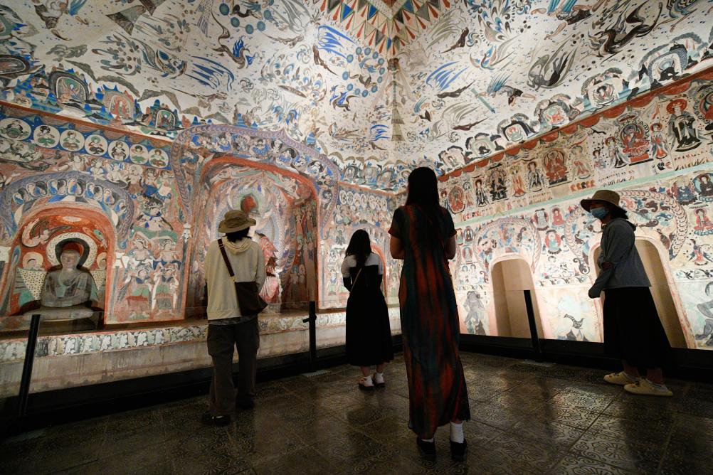 2024年6月7日,在敦煌石窟文物保護研究陳列中心,游客參觀莫高窟復(fù)制洞窟第276窟壁畫。新華社記者 郎兵兵 攝