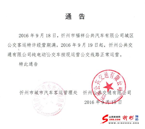 2016年9月18日,忻州市福祥公共汽車有限公司城區(qū)公交客運(yùn)特許經(jīng)營(yíng)期滿。2016年9月19日起,忻州公共交通有限公司純電動(dòng)公交車按現(xiàn)運(yùn)營(yíng)公交線路正常運(yùn)營(yíng)。