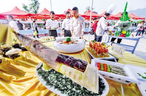 竹筍是杭州市臨安區(qū)的經(jīng)濟(jì)主產(chǎn)業(yè),被稱為臨安農(nóng)民的第一棵“搖錢樹”?!鞍俟S宴”是臨安傳統(tǒng)的特色名宴,被認(rèn)定為“中華特色名宴”,其包含的與竹筍有關(guān)的數(shù)百道筍菜佳肴,凝聚著濃厚的吳越美食文化。這是“百筍宴”活動(dòng)現(xiàn)場(chǎng)展示的與筍有關(guān)的特色菜肴據(jù)新華社 記者 徐 昱 攝