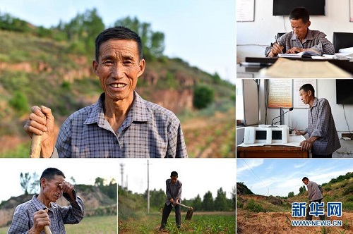 董留照,男,1949年出生,山西省長治市武鄉(xiāng)縣韓道溝村人,現(xiàn)任韓道溝村黨支部書記。近年來,董留照帶領(lǐng)村民大力發(fā)展梅杏種植、家禽養(yǎng)殖,改善村容村貌。2018年,韓道溝村實現(xiàn)整村脫貧,村民年人均收入達到4500多元。 左上:董留照肖像;右上:董留照在村委會整理材料;右中:董留照在村委會通過廣播向村民宣傳農(nóng)業(yè)政策;右下:董留照在地里松土;下中:董留照在地里忙碌;下左:董留照擦拭額頭上的汗水(拼版照片,6月10日攝)。 地處晉東南的山西省長治市,位于由太行山、太岳山環(huán)繞而成的上黨盆地中。在群山中、崖壁上,許多村莊自然條件惡劣,基礎(chǔ)設(shè)施落后,脫貧致富是大山深處人們的迫切心愿。 近年來,一場場脫貧攻堅戰(zhàn),在一個個深山村打響。政府全力探索脫貧路徑的同時,山區(qū)百姓因地制宜,靠自己的雙手和智慧走上致富路,交出了一份扎實的脫貧答卷。 記者在太行山、太岳山一路尋訪,記錄下多位70歲老人的生活。這些共和國的同齡人,親歷了山鄉(xiāng)的巨變,見證著長治山區(qū)脫貧攻堅偉大工程的一步步推進。 新華社記者 詹彥 攝