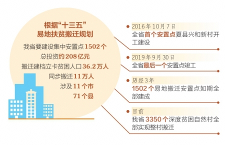 “十三五”易地扶貧搬遷啟動以來,我省有36.2萬貧困人口告別山莊窩鋪,搬進了公共設施配套齊全、產業(yè)就業(yè)措施完善的1502個易地扶貧搬遷集中安置點,這些安置點已成為貧困群眾穩(wěn)定脫貧的新起點、走向全面小康的新支點、實現鄉(xiāng)村振興的新亮點。