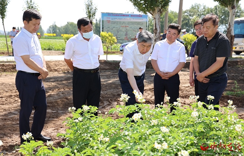 五寨是傳統(tǒng)農(nóng)業(yè)大縣,馬鈴薯種植歷史悠久。如今在小胡會村的馬鈴薯新品種、新技術示范基地,綠油油的馬鈴薯,白色小花競相開放,抬頭遠眺,跨過大型移動噴灌設備,馬鈴薯苗一眼望不到邊?;赝ㄟ^馬鈴薯新品種、新技術的示范,篩選出品質(zhì)優(yōu)、抗病性強、產(chǎn)量高、適宜本土種植的馬鈴薯新品種(系),推動馬鈴薯先進適用栽培新技術的推廣應用。朱曉東走進田壟,察看薯苗長勢,與農(nóng)技專業(yè)人員交流,了解減化肥減農(nóng)藥試驗情況,詢問菜用型馬鈴薯與加工型馬鈴薯的價值區(qū)別。他強調(diào),要切實把五寨80里丁字平川耕地資源用足用好,深研細究新品種新技術,不僅要在馬鈴薯的塊莖上做文章,在莖、葉、花上都要深入研究,調(diào)動專業(yè)機構專業(yè)人員在馬鈴薯花入茶、提取香精等更多方面努力探索,切實放大規(guī)模產(chǎn)業(yè)的獨特優(yōu)勢。