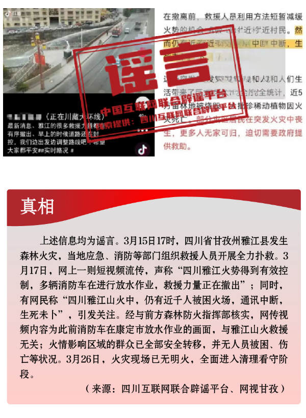 為博流量炮制安全類謠言,引發(fā)恐慌。春季歷來是森林火災高發(fā)時段。加之開春后,工廠企業(yè)復產(chǎn)復工,致災因素明顯增多。3月,全國多地發(fā)生火災事故,一些網(wǎng)民為蹭熱點、博流量,趁機編織謠言,引發(fā)公眾恐慌。3月中旬,四川省甘孜州雅江縣發(fā)生森林火災,在當?shù)貞?、消防等部門組織救援人員全力撲救之際,卻有人編造“四川雅江山火救援力量正在撤出”“雅江仍有近千人被困火場”“雅江山火有三名撲火人員犧牲”等失實信息,嚴重干擾災害應急響應和救援工作。“重慶南坪商業(yè)大樓火災傷亡慘重”“湖南省長沙市天心區(qū)發(fā)生重大刑案,警方發(fā)布懸賞通告”“天津一銀行發(fā)生搶劫”等嚴重失實的涉公共安全類視頻流傳網(wǎng)絡,或是造謠者自編自導,或是利用AI技術偽造,卻引發(fā)群眾恐慌、造成惡劣影響。此外,“綠得發(fā)黑的菠菜不能吃”“清明蔗、毒過蛇”等食品安全類謠言,則是利用了時令和人們對食物中毒的擔憂情緒,夸大其詞、危言聳聽,目的都是販賣焦慮、制造恐慌,進而吸引眼球、騙取流量。