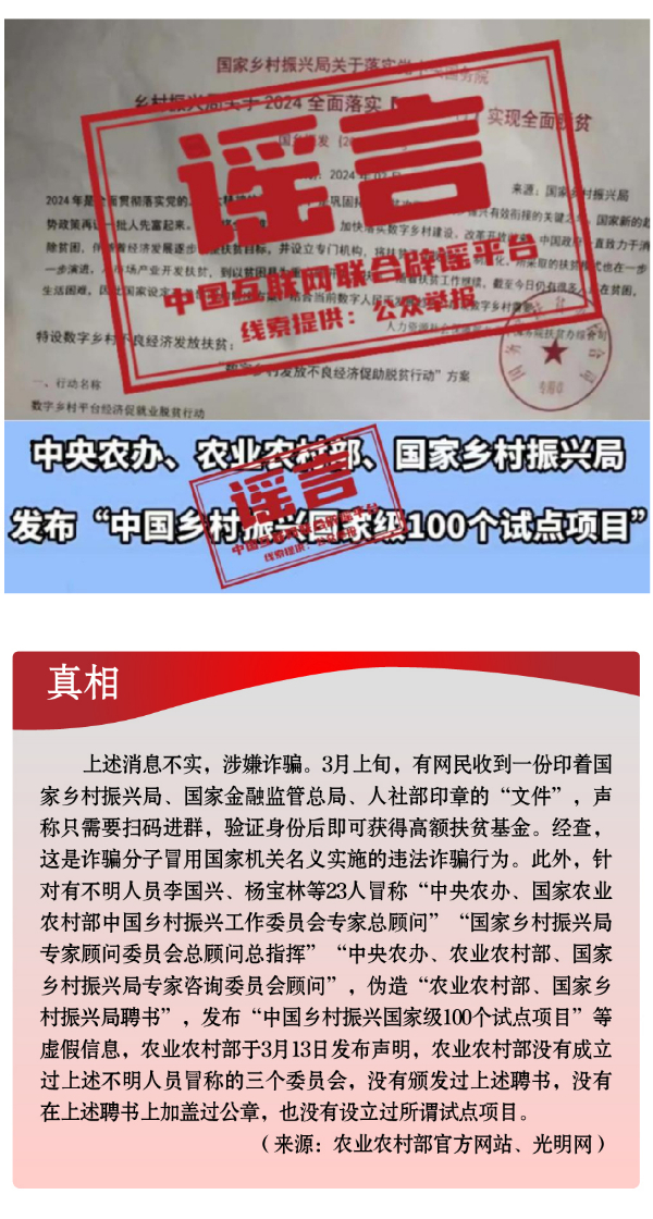 假冒權威杜撰政策類謠言,誤導公眾。3月以來,一些不法分子或機構(gòu)打著權威旗號,假冒國家機關、偽造政府公文、歪曲解讀政策,企圖行騙牟利。如,詐騙分子冒用國家機關名義,假稱“國家發(fā)放2024年鄉(xiāng)村振興扶貧補貼”“鄉(xiāng)村振興項目有國家級試點100個”“‘退稅綠色通道’加快退稅到賬速度”等,實施違法詐騙行為,給社會公眾造成極大信息和資金安全風險。還有人制造、傳播“我國城鄉(xiāng)居民醫(yī)保參保人數(shù)近年來持續(xù)下降,部分地區(qū)農(nóng)村出現(xiàn)醫(yī)保退保潮”“失業(yè)保險金只能領一次,最多領24個月”“我國社?;鹑冀唤o外資機構(gòu)管理”等一系列與事實嚴重不符的涉公共謠言,迷惑性大、蠱惑性強,極易誤導公眾,對我國現(xiàn)有社保政策和相關工作造成負面影響。