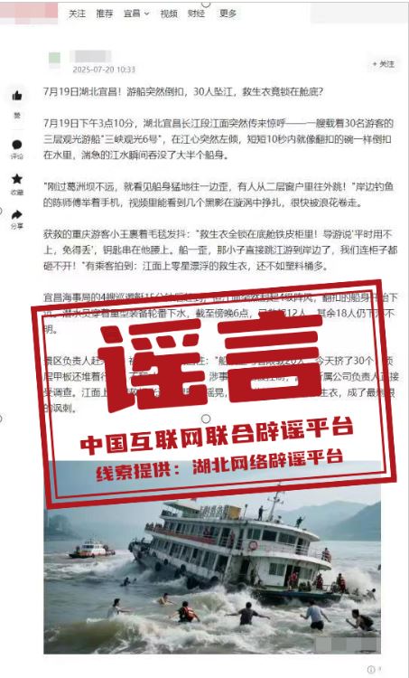 謠言:湖北宜昌游船突然倒扣、30人墜江?