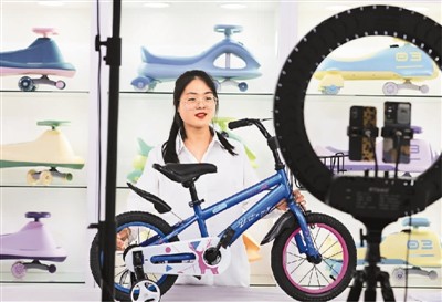 河北省邢臺(tái)市廣宗縣鐵牛自行車(chē)業(yè)有限公司的工作人員日前通過(guò)線上廣交會(huì)直播推介童車(chē)產(chǎn)品。王 壘攝(人民圖片)