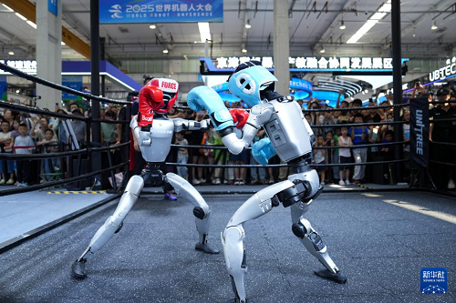 在2025世界機器人大會展館內(nèi),觀眾在宇樹機器人展臺觀看機器人拳擊展示(8月11日攝)。新華社記者 鞠煥宗 攝