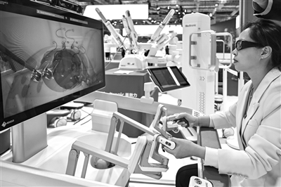 參會者在第七屆進(jìn)博會醫(yī)療器械及醫(yī)藥保健展區(qū)體驗操作一款外科手術(shù)機(jī)器人。(資料照片)