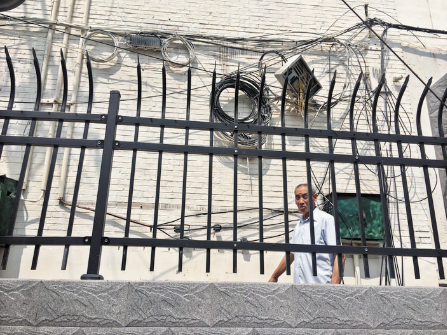 記者在位于該路口的市化工局宿舍樓側(cè)面墻上看到布滿(mǎn)“蛛網(wǎng)”般的電線,藕斷絲連,錯(cuò)綜復(fù)雜。小區(qū)住戶(hù)劉大爺告訴記者,這堵墻上的電線種類(lèi)繁多復(fù)雜,最要緊的是其中的高壓電線固定在距離地面只有1米至1.5米左右的墻上,電線外面的PVC保護(hù)管已經(jīng)因年久失修嚴(yán)重老化,電線直接裸露在外,遇上下雨打雷天氣非常危險(xiǎn),平時(shí)小孩玩耍路過(guò)也不安全。據(jù)記者觀察,在距離這堵墻約兩米的地方有1根電線桿,宿舍樓墻上離地面最近的4根黑色電線就是從這根電桿上接進(jìn)來(lái)的,電線橫搭部分基本暴露在外,特別不安全。小區(qū)居民希望相關(guān)部門(mén)能夠盡快消除隱患,給居民們一個(gè)安全放心的居住環(huán)境。