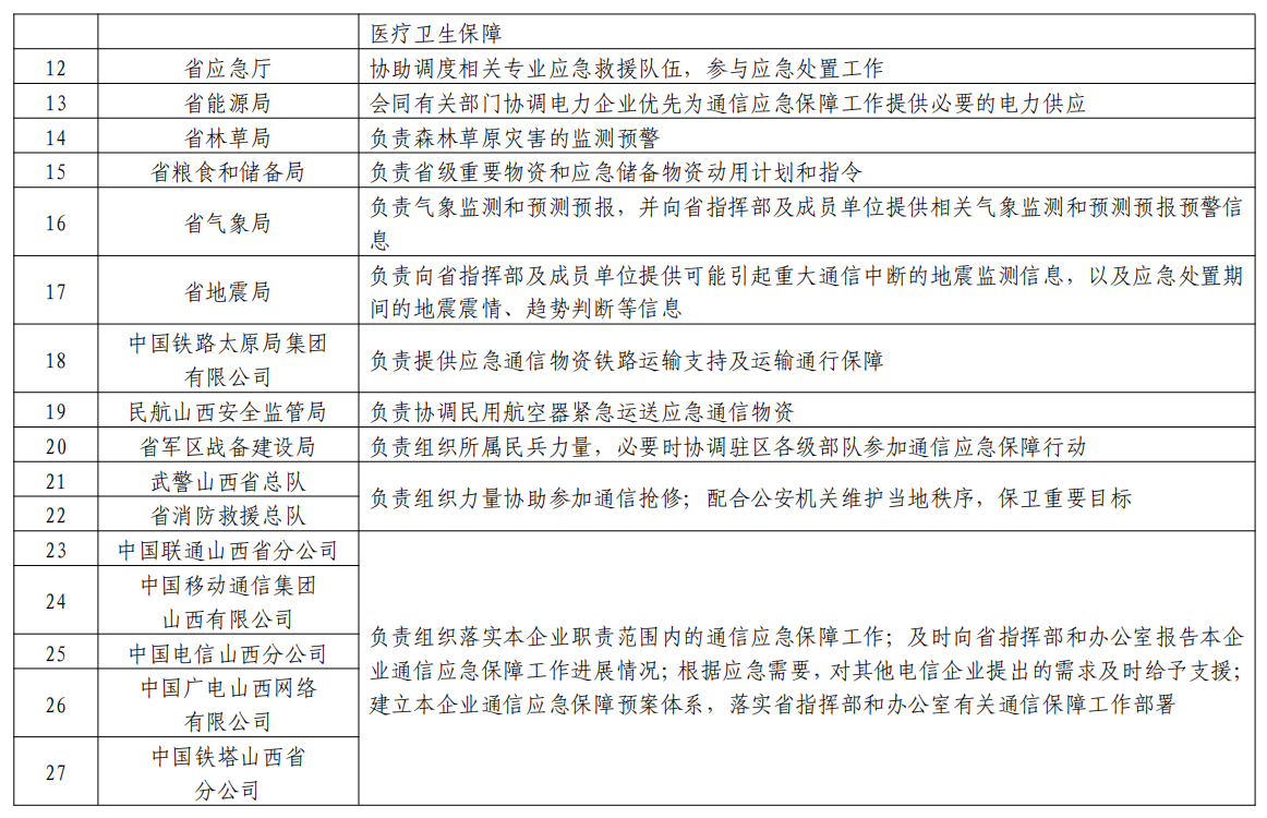 成員:省通信管理局、省委宣傳部、省委網(wǎng)信辦、省發(fā)展改革委、省公安廳、省財政廳、省自然資源廳、省交通廳、省水利廳、省衛(wèi)健委、省應急廳、省能源局、省林草局、省糧食和儲備局、省氣象局、省地震局、中國鐵路太原局集團有限公司、民航山西安全監(jiān)管局、省軍區(qū)戰(zhàn)備建設局、武警山西省總隊、省消防救援總隊以及省基礎(chǔ)電信企業(yè)等部門單位相關(guān)負責人。