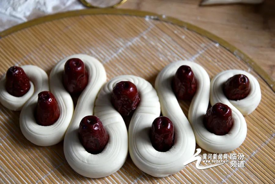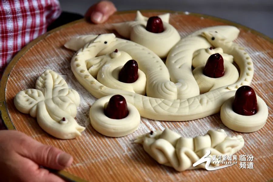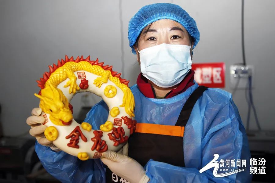 在晉南,蒸花饃是不可缺少的一項年俗。花饃藝人用面粉、果蔬汁、雞蛋和牛奶等食材為原料,巧手捏制出“金龍迎春”“迎春納?!钡仍⒁饧榈南盗谢x,為即將到來的龍年春節(jié)增添了濃濃的年味。