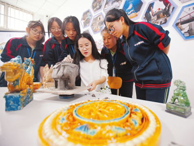 介休琉璃第五代傳承人劉文婷在介休市職業(yè)中學(xué)向?qū)W生示范琉璃制作工藝。