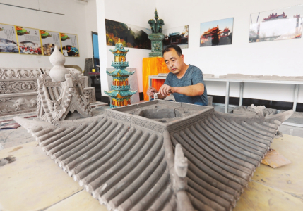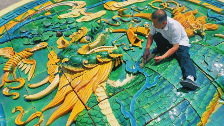 4月22日,國家級(jí)非遺項(xiàng)目琉璃燒制技藝傳承人劉開寶將制作的琉璃制品“麒麟獻(xiàn)端”交付客戶。