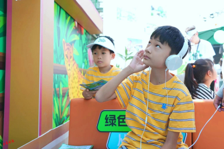 “有啄木鳥、有青蛙,剩下的我聽不出來……”在“萬物有聲”游戲環(huán)節(jié),小朋友認真地和環(huán)保志愿者說。在這個環(huán)節(jié),參與者佩戴耳機后,可以根據(jù)聽到的聲音猜動物的名稱。各種動物的聲音,著實吸引了不少小朋友的參與,有的小朋友還模仿發(fā)出聲音的動物形象,惟妙惟肖,讓現(xiàn)場不少人笑出聲來。
