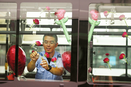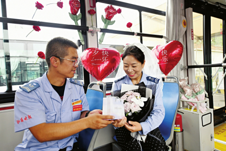 七夕節(jié)即將到來(lái),8月8日,在太原公交第三汽車(chē)分公司,公交車(chē)廂里上演了一場(chǎng)別樣的浪漫——堅(jiān)守在一線的兩名公交司機(jī)閻樹(shù)德和焦更新,分別為出車(chē)回來(lái)的妻子準(zhǔn)備了大大的驚喜。用送花、提前準(zhǔn)備飯菜、布置車(chē)廂等行動(dòng)表達(dá)自己的愛(ài)意。