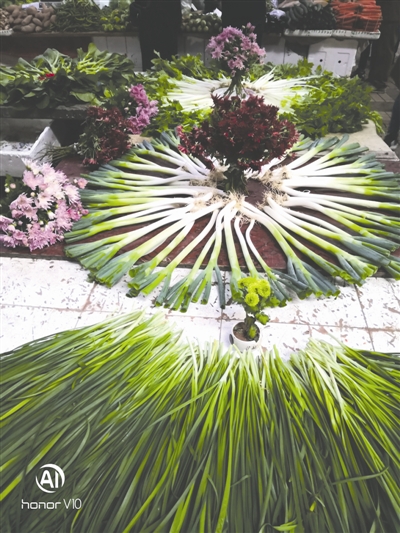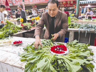 “那時孩子在成都理工大學(xué)上學(xué),家里經(jīng)濟(jì)壓力很大?!?年前,王美成接替妻子開始在城區(qū)賣菜,他發(fā)現(xiàn)有時菜并不好賣?!坝幸淮挝胰ゾ频陞⒓友鐣吹骄频昀镉械牟似费b飾挺好看,我就想是不是也可以把花裝飾在菜攤上。嘗試之后發(fā)現(xiàn)效果挺好,大家都喜歡。”