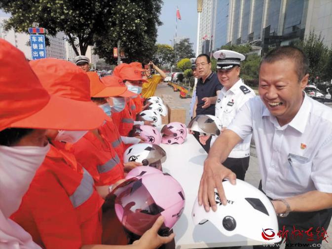 今年是我市創(chuàng)建全國文明城市的決戰(zhàn)決勝年,廣大環(huán)衛(wèi)工人一直默默奮斗在崗位上,為我市創(chuàng)文不斷努力。市公安局交警支隊始終牽掛著奮戰(zhàn)在基層一線的環(huán)衛(wèi)工人,支隊以此次贈送頭盔活動為契機,持續(xù)關(guān)心關(guān)愛環(huán)衛(wèi)工人的生命安全和身體健康。市公安局交警支隊負(fù)責(zé)人表示:“環(huán)衛(wèi)工人大多騎著電動三輪車或人力保潔車穿梭在大街小巷,機動車道是他們的主要作業(yè)區(qū)之一,佩戴安全頭盔,可以大大增加他們的安全系數(shù)。同時,環(huán)衛(wèi)等重點行業(yè)的示范引領(lǐng)作用,將有力帶動市民遵紀(jì)守法、安全出行,為文明城市創(chuàng)建打造一道亮麗的風(fēng)景線。”圖為捐贈活動現(xiàn)場。張志遠(yuǎn) 攝影報道