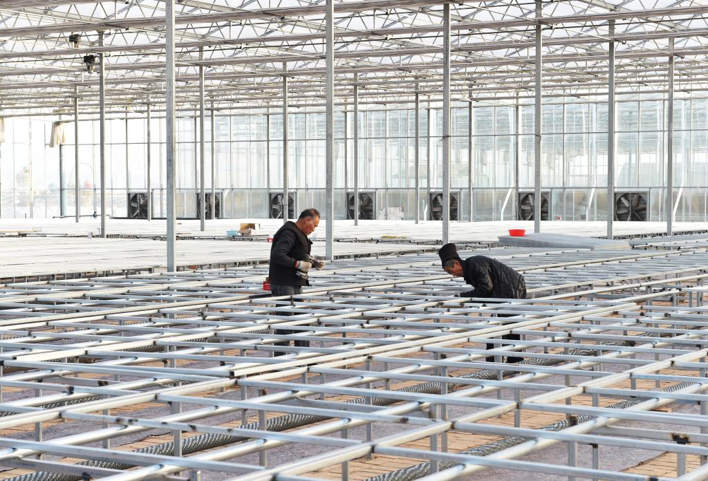 建設(shè)中的雙膜溫室大棚。 馮曉磊 攝