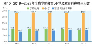 全年全省研究生教育招生2.1萬(wàn)人,在學(xué)研究生6.1萬(wàn)人,畢業(yè)生1.6萬(wàn)人。普通本科招生14.7萬(wàn)人,在校生55.1萬(wàn)人,畢業(yè)生13.8萬(wàn)人。職業(yè)本專科招生13.8萬(wàn)人,在校生41.2萬(wàn)人,畢業(yè)生12.5萬(wàn)人。中等職業(yè)教育招生13.8萬(wàn)人,在校生41.6萬(wàn)人,畢業(yè)生13.5萬(wàn)人。普通高中招生21.2萬(wàn)人,在校生67.8萬(wàn)人,畢業(yè)生22.1萬(wàn)人。初中招生37.1萬(wàn)人,在校生112.2萬(wàn)人,畢業(yè)生34.9萬(wàn)人。小學(xué)招生39.9萬(wàn)人,在校生231.8萬(wàn)人,畢業(yè)生37.9萬(wàn)人。特殊教育招生0.4萬(wàn)人,在校生2.0萬(wàn)人,畢業(yè)生0.4萬(wàn)人。學(xué)前教育在園幼兒91.8萬(wàn)人。(圖10)