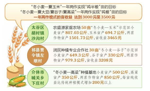 令人欣喜的是,實(shí)踐給出了響亮而積極的回答。我省“冬小麥—夏玉米”一年兩作實(shí)現(xiàn)“噸半糧”田的目標(biāo),“冬小麥—夏大豆/夏谷子/夏高粱”一年兩作實(shí)現(xiàn)“噸糧”田的目標(biāo),一年兩作模式的畝收益達(dá)到3000元至3500元。太谷區(qū)胡村鎮(zhèn)沙溝村農(nóng)盛源家庭農(nóng)場(chǎng)50畝“冬小麥—玉米”示范田小麥畝產(chǎn)807.03公斤、玉米畝產(chǎn)694.7公斤,兩茬作物畝產(chǎn)1501.73公斤,畝收益3465元。祁縣賈令鎮(zhèn)左墩村潤(rùn)民種植專業(yè)合作社30畝“冬小麥—谷子”示范田小麥畝產(chǎn)649.3公斤、谷子畝產(chǎn)330公斤,兩茬作物畝產(chǎn)979.3公斤,畝收益3208元。介休市城關(guān)鄉(xiāng)下莊村“冬小麥—高粱”種植基地小麥畝產(chǎn)500公斤、高粱畝產(chǎn)350公斤,兩茬作物畝產(chǎn)850公斤,每畝純收益比傳統(tǒng)種植模式增加200元以上。