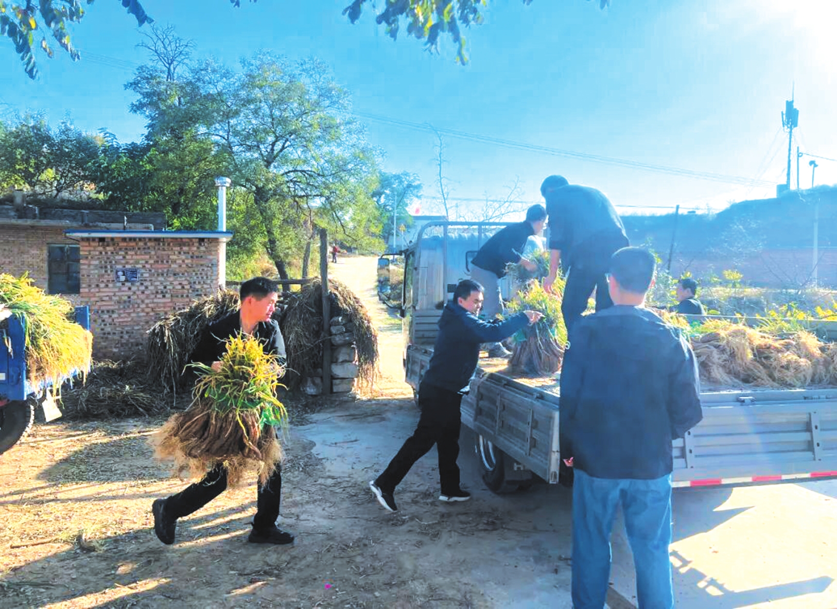 村里的部分孤寡老人,子女不在身邊,又缺乏交通工具,辛苦種植的紅蔥只能依賴商販來村定點(diǎn)收購,價(jià)格也不太理想。駐村第一書記阮傳飛說:“不能讓老百姓的汗白流,我們作為駐村的黨校人要行動(dòng)起來!”于是帶領(lǐng)隊(duì)員們化身“快遞員、裝卸工”,開著貨車與村干部一起來到農(nóng)戶門前,直接將紅蔥裝車運(yùn)往忻州市區(qū)銷售,打通紅蔥從農(nóng)田到餐桌的直銷通道。隊(duì)員們分工協(xié)作,稱重、捆綁、搬運(yùn)、碼放,汗水混著泥土浸濕了衣背卻無人停歇。一上午的工夫,就裝了滿滿一車。顧不得短暫休息,隊(duì)員們又馬不停蹄地趕往市區(qū),爭取在天黑前運(yùn)回市里進(jìn)行售賣。丁家溝75歲的焦大爺激動(dòng)地說:“多虧了這些駐村干部和年輕同志,要不是他們幫我想辦法,我這些蔥得啥時(shí)候才能賣出去??!”