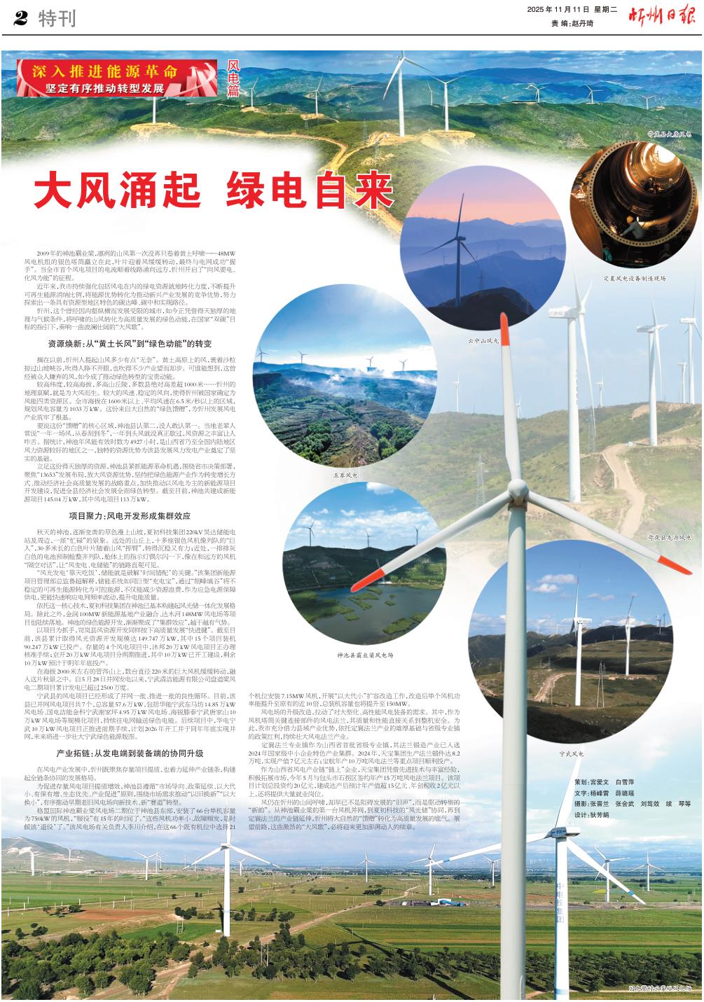 寧武縣的風(fēng)電項(xiàng)目已經(jīng)形成了并網(wǎng)一批、推進(jìn)一批的良性循環(huán)。目前,該縣已并網(wǎng)風(fēng)電項(xiàng)目共7個(gè),總?cè)萘?7.6萬kW,包括華能寧武東馬坊14.85萬kW風(fēng)電場、國電潔能金科寧武謝家坪4.95萬kW風(fēng)電場、海銳滕泰寧武唐家山10萬kW風(fēng)電場等規(guī)?;?xiàng)目,持續(xù)往電網(wǎng)輸送綠色電能。后續(xù)項(xiàng)目中,華電寧武10萬kW風(fēng)電項(xiàng)目正推進(jìn)前期手續(xù),計(jì)劃2026年開工并于同年年底實(shí)現(xiàn)并網(wǎng),未來將進(jìn)一步壯大寧武綠色能源版圖。