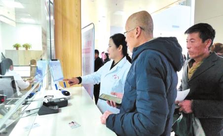 醫(yī)院工作人員引導(dǎo)就診病人完成注冊(cè)流程