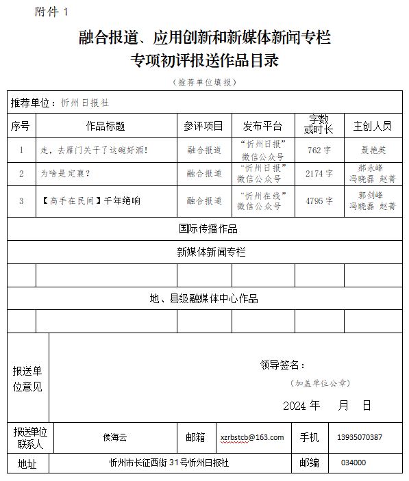 經忻州日報社編委會研究決定,以下作品擬推薦申評第33屆山西新聞獎,現(xiàn)予以公示。有反對意見者,請將反對意見書面報至統(tǒng)計考核部。