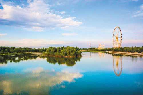沿著河岸邊的石板路緩緩向西前行,手中撫過岸邊的花崗石欄桿,偶有微風(fēng)拂面,帶起耳畔凌亂的發(fā)絲,讓人頓覺神清氣爽,想要沉醉在眼前的迷人風(fēng)光中。這時(shí),不遠(yuǎn)處忽然傳來人們的歡呼聲和尖叫聲,我上前一看,原來已經(jīng)走到了云中河游樂園。游樂園里的娛樂項(xiàng)目多樣,其中最醒目的便是那高達(dá)88米、修建時(shí)高度居山西第一的摩天輪,伴隨著悅耳的歌謠,摩天輪緩緩地轉(zhuǎn)動(dòng)著,帶著人們對(duì)浪漫的遐想。