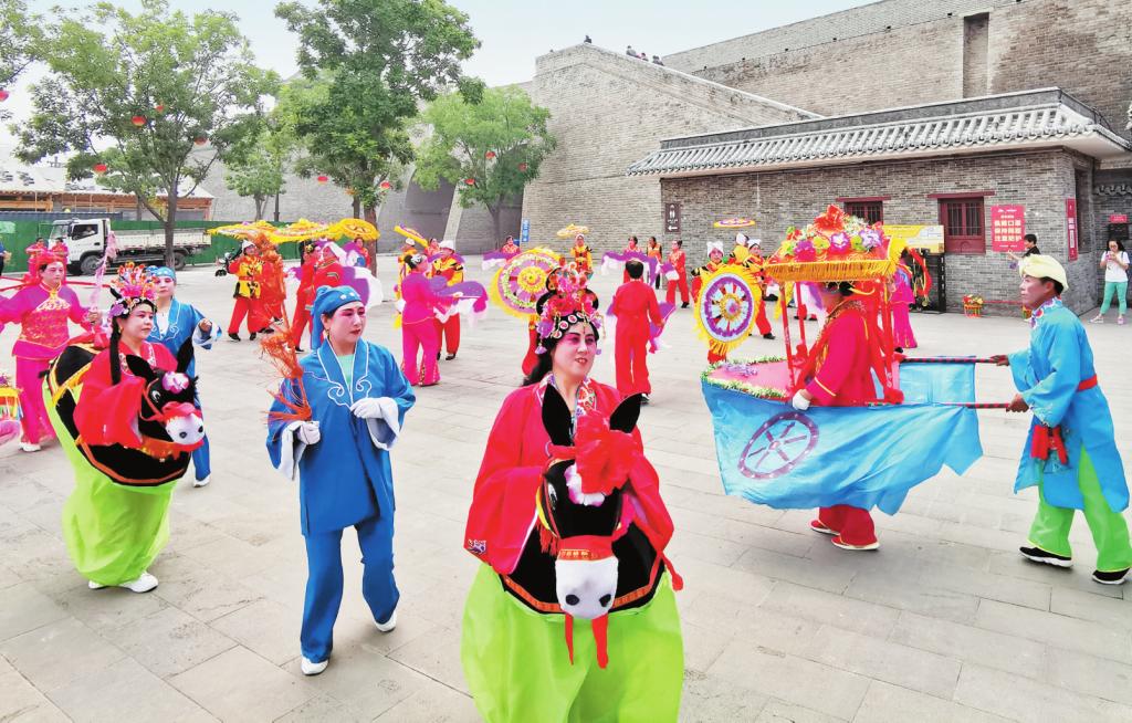 忻州“跑驢”俗稱“兜毛驢”,是民間舞蹈之一。伴奏以歡快、喜慶的八音為主,或可現場用嗩吶、小鼓、大鈸和小鈸等伴奏?!芭荏H”表演多以一男一女為一組(也有女扮男裝的),表演節(jié)目有“夫妻探親”“回娘家”“趕集路上”等。其中以小媳婦兒回娘家和表現農村老漢和農村老大娘的故事情節(jié)較為普遍。表演時小媳婦“騎驢”磨磨蹭蹭、小伙子趕“驢”風情萬種,運用舞蹈動作夸張地演繹驢的倔強和趕驢者的執(zhí)著。“跑驢”的舞步很多,有平閃步、上山步、下山步、小跑步、驚驢步、后踢步、過河步等。表演形式有踩四腳、卷白菜、龍盤柱等,表演者即興使用,不受限制。演員相互配合,表演動作夸張,“騎驢上路”“騎驢下坡”“騎驢過河”“失蹄臥水”“毛驢抖水”“驢失前蹄”“毛驢跳躍”等舞姿,生動活潑、詼諧幽默、趣味無窮,備受歡迎。(市文化館供稿)