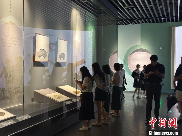 中新網(wǎng)南寧7月10日電 (張廣權(quán))7月10日,廣西壯族自治區(qū)博物館內(nèi),76件明清扇面山水珍品集中呈現(xiàn),吸引游客駐足圍觀。