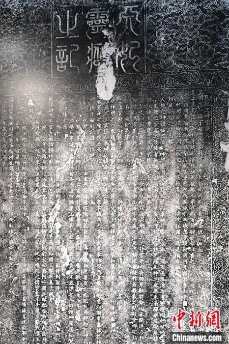 《天妃靈應(yīng)之記》碑高162厘米、寬78厘米、厚16厘米。碑以黑色頁(yè)巖為料,碑額正中篆書(shū)“天妃靈應(yīng)之記”,周邊飾以祥云捧月(日)圖案,兩旁陰刻如意云水紋,碑體邊框飾一周纏枝花卉紋。碑文楷書(shū)直下計(jì)31行,全文1177字,除其中有若干字磨損外,碑文清晰,至今基本完整可讀。