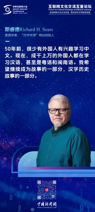 中新網(wǎng)烏鎮(zhèn)11月21日電(林卓瑋)“事物總是在變化,但文化的傳承永遠(yuǎn)需要我們?nèi)ヅ??!?1日,在世界互聯(lián)網(wǎng)大會(huì)烏鎮(zhèn)峰會(huì)互聯(lián)網(wǎng)文化交流互鑒論壇上,被譽(yù)為“漢字叔叔”的美國(guó)漢學(xué)家斯睿德(Richard Sears)從創(chuàng)新傳承漢字的個(gè)人經(jīng)歷出發(fā),講述了一段跨越75年、連接中美的傳奇故事。 現(xiàn)年75歲的斯睿德出生在一個(gè)人人都說(shuō)英語(yǔ)的美國(guó)小鎮(zhèn)。1972年,對(duì)單一文化環(huán)境感到厭倦的他,開始學(xué)習(xí)中文,也開啟了他與漢字的不解之緣。