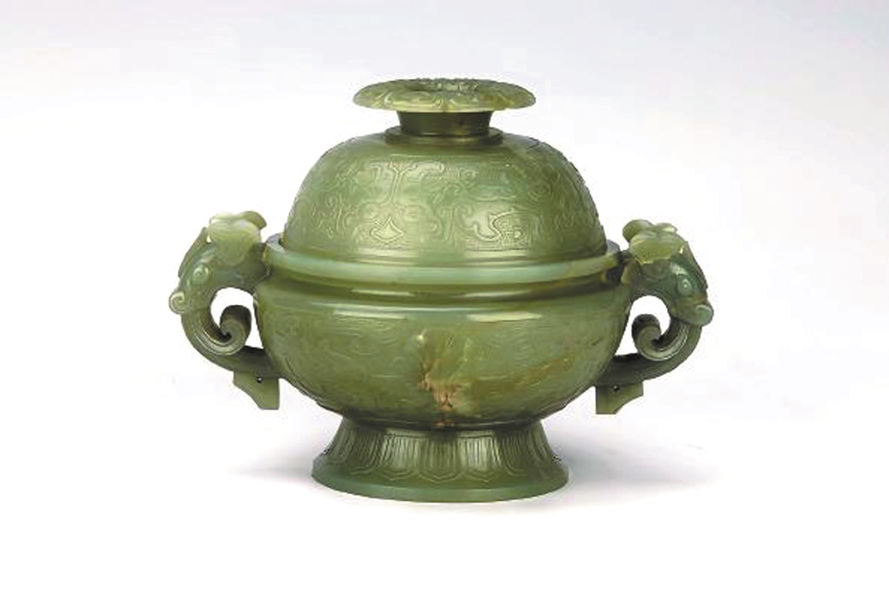 這件清代的獸面紋玉奩,高12.5厘米,口徑11.1厘米,底徑8.2厘米。青玉質(zhì)地,器物以整塊青玉為材料制作,圓形,由上下兩部分組成,高圈足。上面為奩蓋,下面為奩身。奩蓋看上去就像一只倒扣的大碗,釉面光潔,圓潤自然;蓋頂為空心,雕刻仰蓮瓣紋,蓋面雕刻獸面紋,紋飾細(xì)膩生動(dòng)。奩身與奩蓋相扣合,頸部兩側(cè)相對(duì)稱地各鏤雕獸首耳一只,分別與奩腹下相接。腹部滿浮雕獸面紋。圈足外一圈凸雕仰蓮紋,隨器形伸展,充滿動(dòng)感,讓人心生聯(lián)想:若是將之置于水中,一定頗有幾分清人汪懋麟筆下“玉奩亂潑脂水濃,春波半濺青裙?jié)瘛钡囊馊ぶ?。(李笙清?/p>
